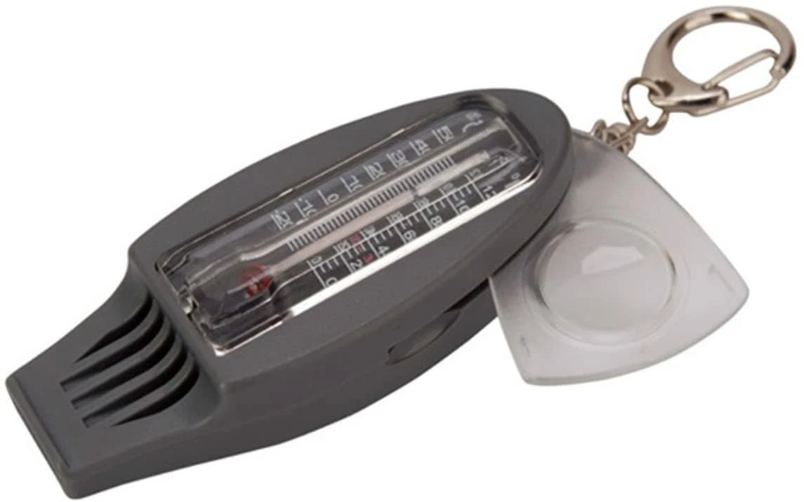 The 4-function whistle includes a compass, a thermometer and a magnifying glass. Great for trips into nature or even as part of a survival/ emergency kit.